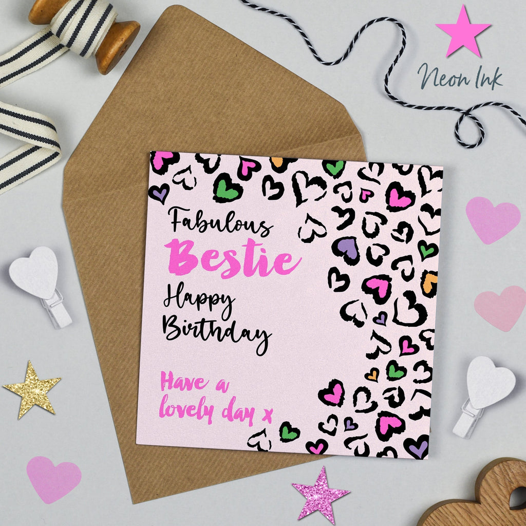 My favourite collection of birthday cards from Michelle is her Leopard Love collection. It’s a bright, cheerful, and fun multi-coloured leopard print design like you’ve never seen before. The leopard spots are in the shape of hearts, and they are multiple colours that coordinate perfectly with the neon pink colour scheme the collection has. This collection is specifically designed for the women in your life with cards for Sister, Daughter, Daughter-in-law, Glamma, Bestie, Cousin, and more.